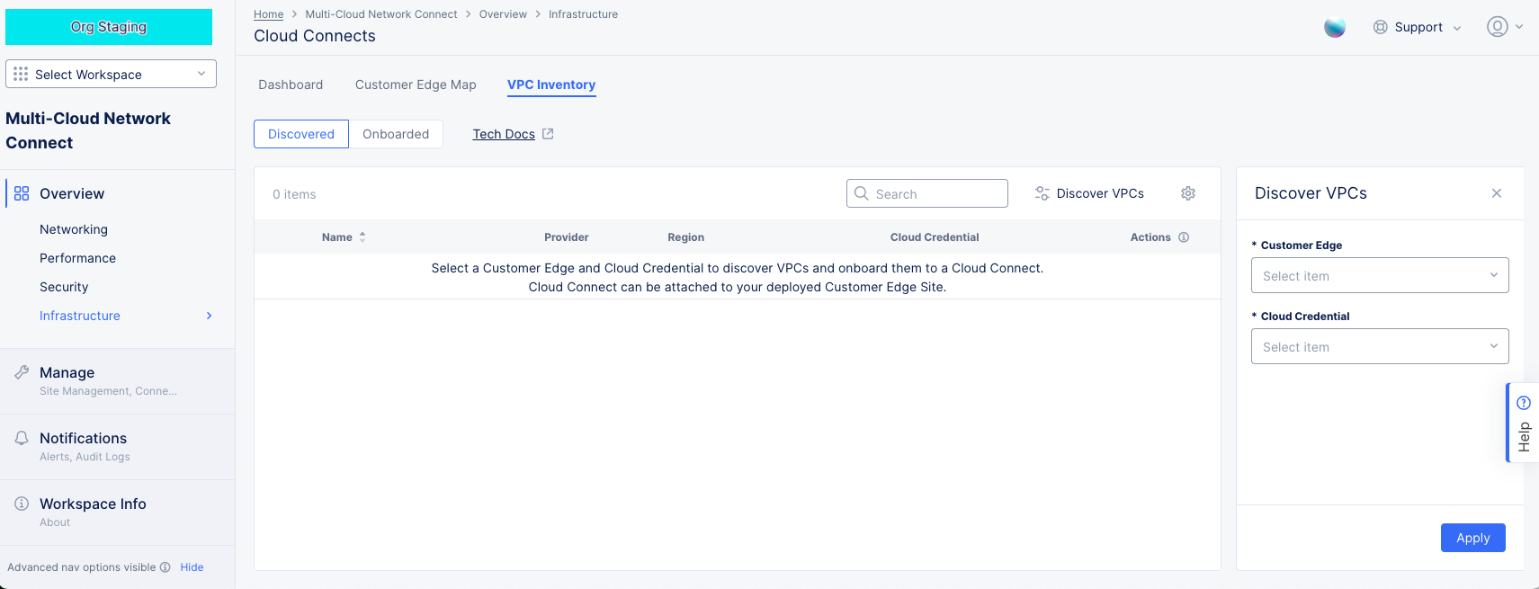 Start by selecting a CE from the Customer Edge drop-down menu and your credentials from the Cloud Credentials drop-down menu. Then click Apply. This will populate the table with discovered VPCs.